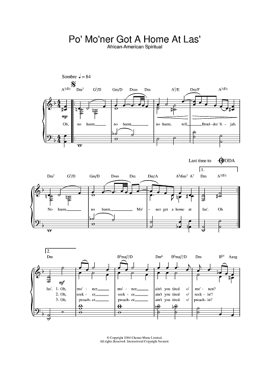 Digital Sheet Music for Po' Mo'ner Got A Home At Las' by scored for Piano/Vocal/Chords; id:378587