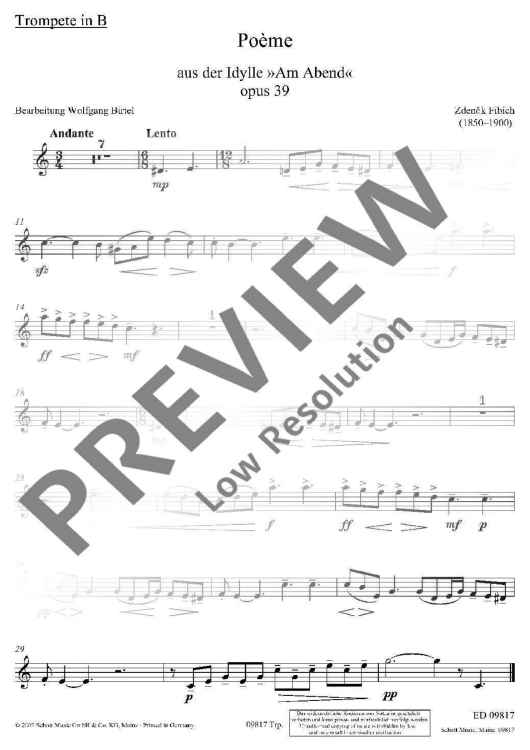 The reputation of the Bohemian composer Zdenek Fibich (1850-1900) has always been somewhat overshadowed by that of Bedrich Smetana and Antonín Dvorák. This is a pity, for Fibich, though he died young, made an equally important contribution to the emerging Czech national styl with his wide range of compositions. After starting piano lessons with his mother as his first teacher, the boy went on to music school in Prague and then to the Leipzig Conservatoire, where he learned his craft as a composer. He spent a few months teaching piano in Paris and then continued his studies with Vinzenz Lachner in Mannheim. Prague was eventually to become the centre for Fibich's musical activities: as his dream of a post at the Conservatoire remained unfulfilled, his main employment was giving private music lessons and as a composer Zdenek Fibich wrote works for many musical genres: vocal and chamber music, piano pieces and orchestral works, operas, stage music and melodramas, literary recitals with orchestral accompaniment to which he gave a new lease of life. There are biographical traces to be found in the 376 piano pieces of the collection 'Moods, Impressions and Reminiscences' Op. 41, written in 1892-98: this tells of his love for his pupil Anezka Schulzová in the form of a 'piano diary'. Its four volumes were frequently a source of material for other works, such as the symphonic poem 'In the Evening' Op. 39 (also known as 'A Summer's Evening' and 'At Twilight'), written in 1893. For his second subject in this 'Idyll' Fibich used the minature no. 139, entitled 'Lento', from his collection of piano pieces. The violinst Jan Kubelík played the melody from 1908 onwards with the title 'Poème', and the work is still known today under this title: its easy charm has made it a favourite tune in the classical repertoire. This arrangement is based on the orchestral version from which other material was adapted for the Prelude.