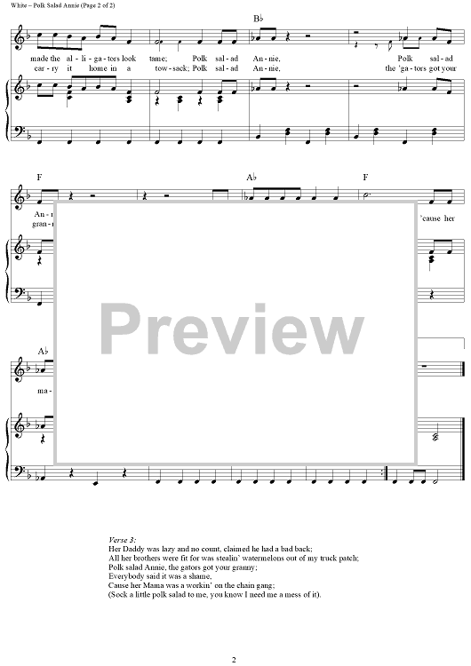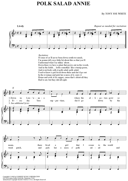 Digital Sheet Music for Polk Salad Annie by Tony Joe White scored for Piano/Vocal/Chords; id:364066