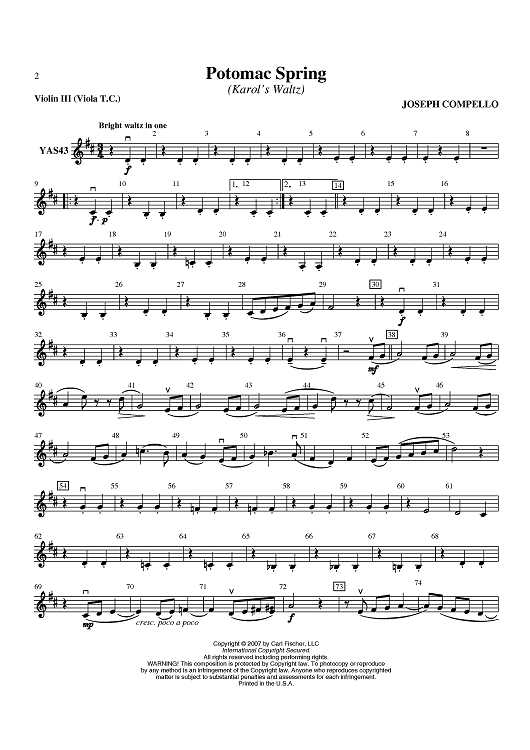 Digital Sheet Music for Potomac Spring - Violin 3 by Joseph Compello scored for Orchestra; id:408113