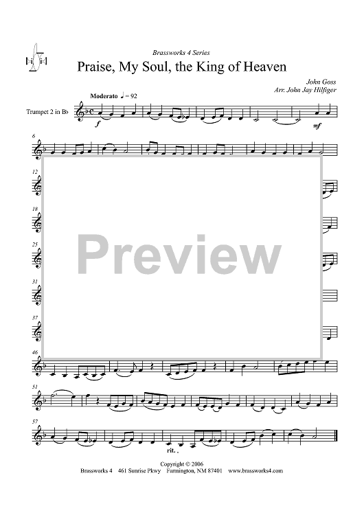 Digital Sheet Music for Praise, My Soul, the King of Heaven - Trumpet 2 in B-flat by John Goss, John Jay Hilfiger scored for Brass Quintet; id:321165