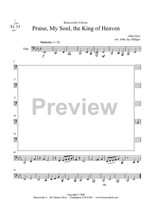 Digital Sheet Music for Praise, My Soul, the King of Heaven - Tuba by John Goss, John Jay Hilfiger scored for Brass Quintet; id:321168