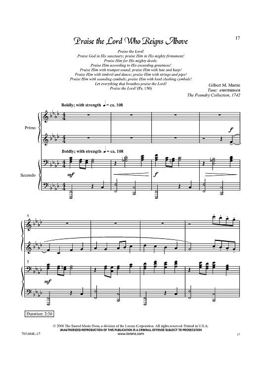 Digital Sheet Music for Praise the Lord Who Reigns Above by Gilbert M. Martin, The Foundry Collection scored for Piano Duet; id:433973