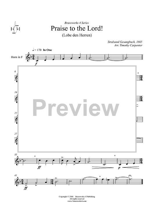 Digital Sheet Music for Praise to the Lord! - Horn in F by Timothy Carpenter, Stralsund Gesangbuch scored for Brass Quintet; id:410406
