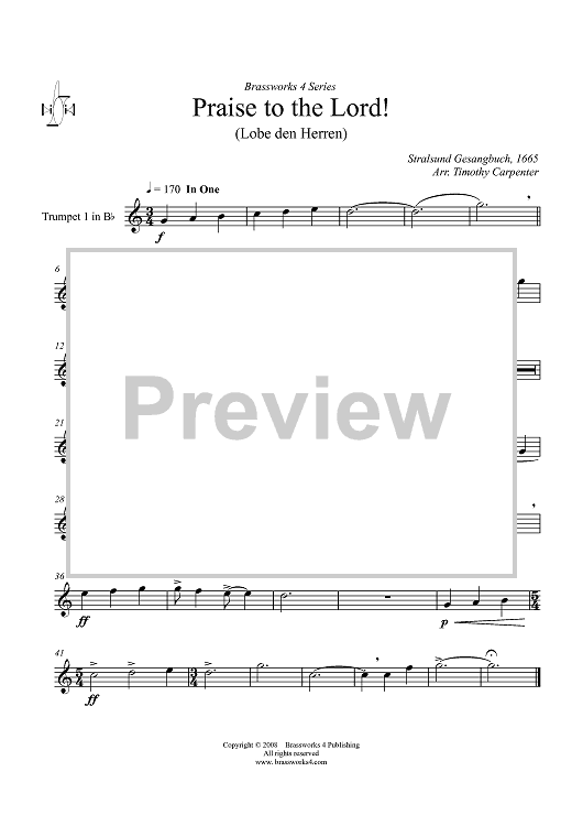 Digital Sheet Music for Praise to the Lord! - Trumpet 1 in B-flat by Timothy Carpenter, Stralsund Gesangbuch scored for Brass Quintet; id:410404