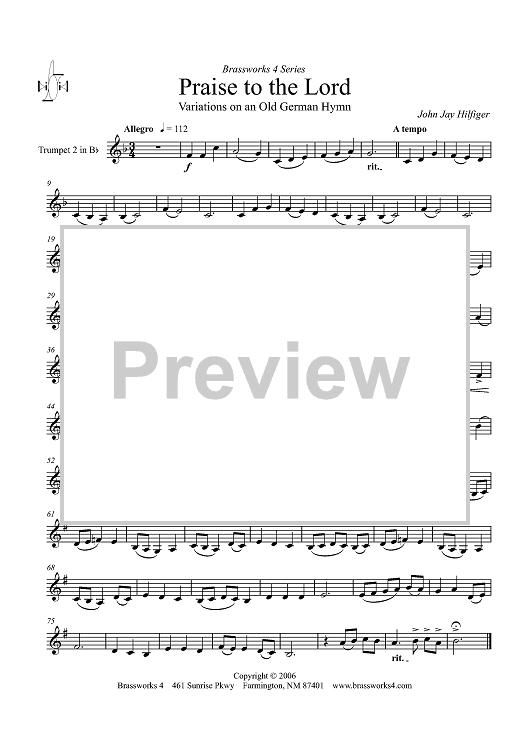 Digital Sheet Music for Praise to the Lord - Trumpet 2 in B-flat by John Jay Hilfiger scored for Brass Quartet; id:321399