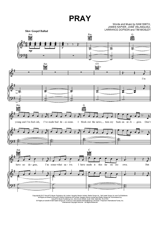 Digital Sheet Music for Pray by Tim Mosley, Sam Smith, James Napier, José Velasquez, Larrance Dopson scored for Piano/Vocal/Chords; id:465691