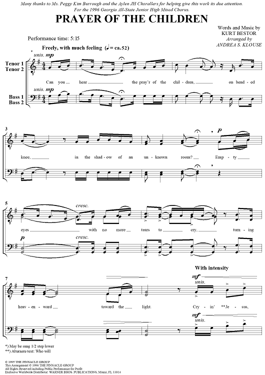 Digital Sheet Music for Prayer of the Children - TTBB Choral by Kurt Bestor, Andrea S. Klouse scored for Four-part Male Chorus; id:297679