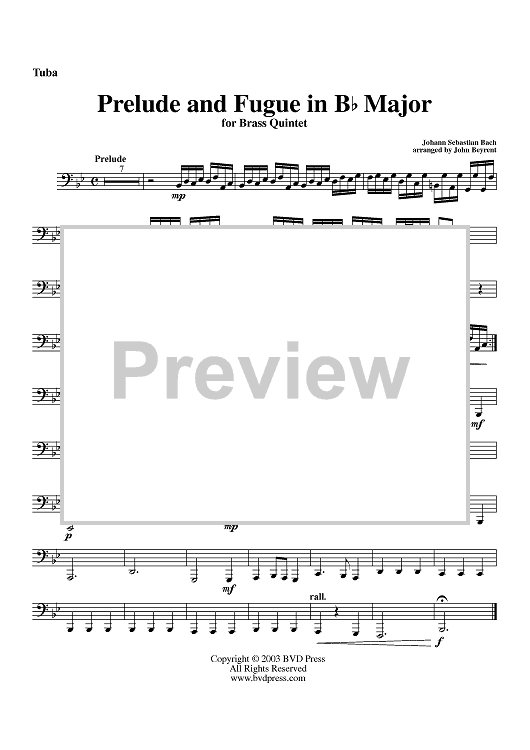 Digital Sheet Music for Prelude and Fugue in B-flat Major - Tuba by John Beyrent, Johann Sebastian Bach scored for Brass Quintet; id:312916