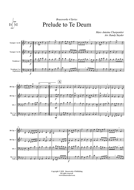 Digital Sheet Music for Prelude to Te Deum - Score by Marc-Antoine Charpentier, Randy Snyder scored for Brass Quartet; id:410319
