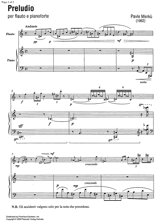 Digital Sheet Music for Preludio - Score by Pavle Merkù scored for Flute/Piano; id:334966
