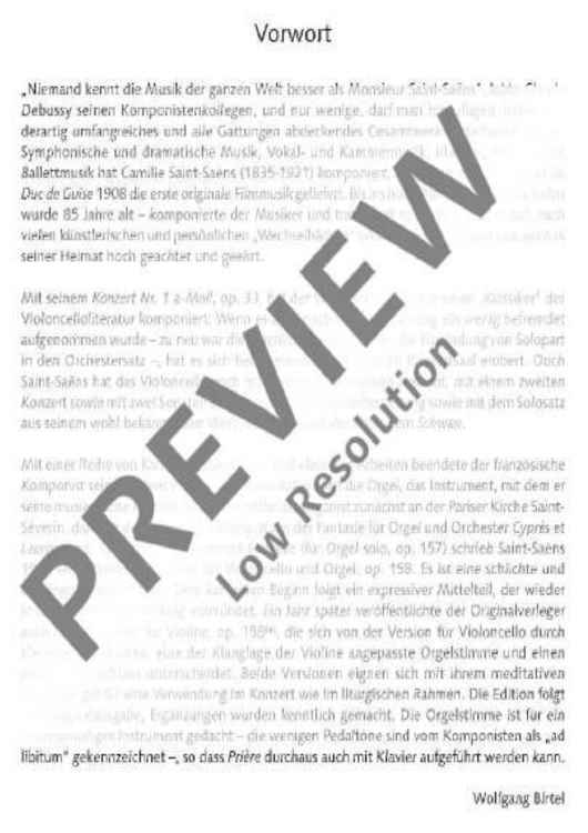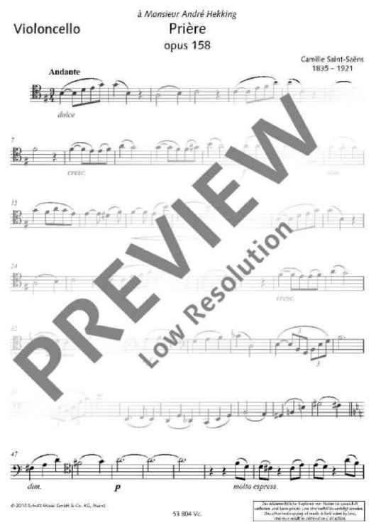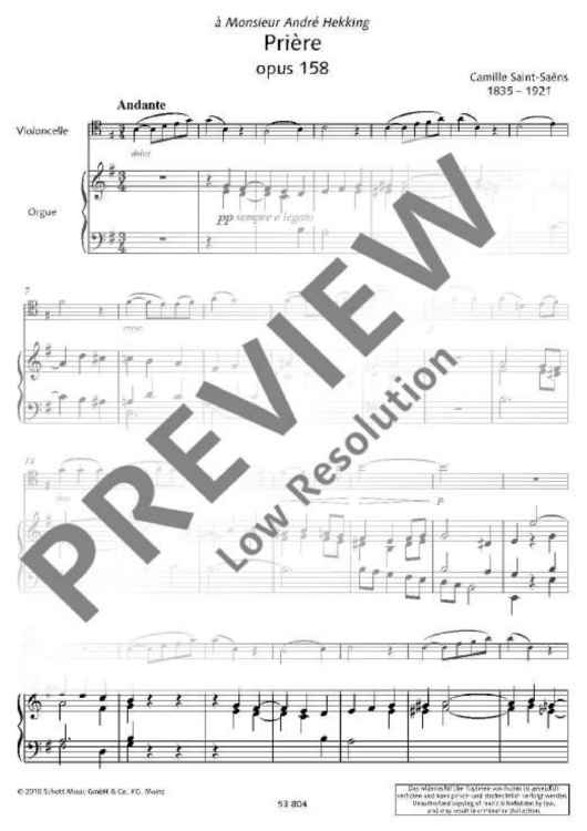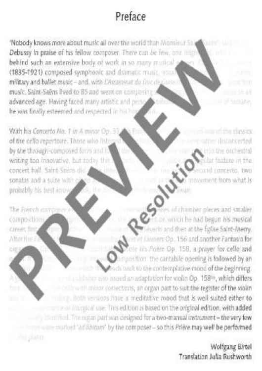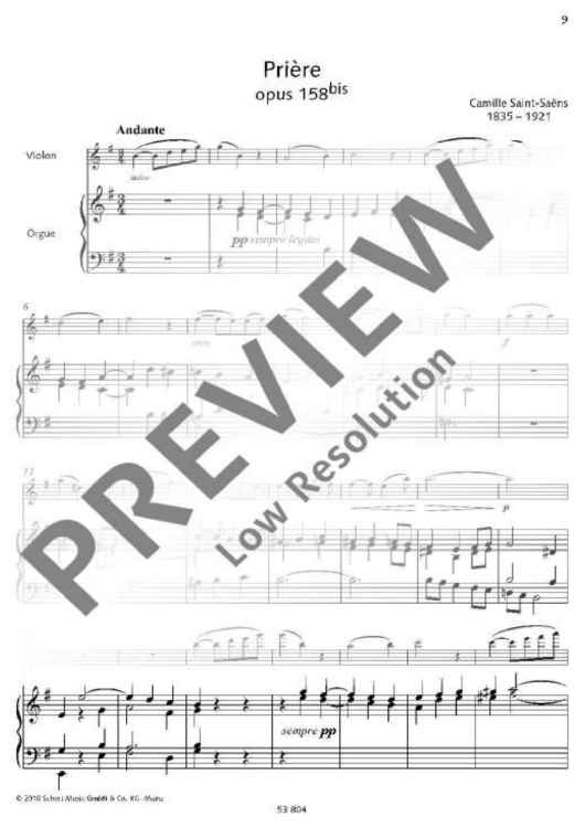 When writing his Concerto No. 1 in A minor, Op. 33, Camille Saint-Saëns wrote a "classic" of the violoncello literature. But the French musician even wrote other works for this in-strument: further solo works, a second concerto as well as two sonatas, a suite with piano accompaniment and the solo movement from his probably best-known work, The Carnival of Animals: the Swan. The French musician completed his extensive oeuvre with a series of chamber music pieces and smaller works, but also wrote compositions for the organ, for the instrument he had started his musical career with. After two fantasias for organ, Saint-Saëns eventually wrote his Prière, his Prayer, for violoncello and organ, Op. 158 in 1919. It is a simple and catchy tune: The cantabile beginning is followed by an expressive middle section which leads back to the quiet beginning. One year later, the original publisher also published an adaptation for violin, Op. 158bis which differs from the violoncello version in small corrections, an organ part adjusted to the register of the violin and a modified end-ing. Due to their meditative character, both versions are ideal for concert or liturgical per-formances. The organ part is meant for a double-manual instrument - the few pedal notes being marked "ad libitum" by the composer - so that Prière can also be performed on the piano.