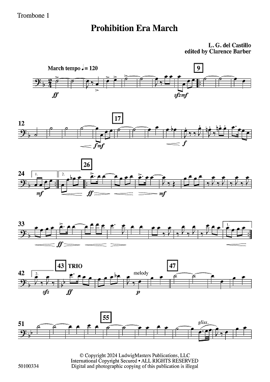 Digital Sheet Music for Prohibition Era March - Trombone 1 by Clarence Barber, Lloyd Gould del Castillo scored for Concert Band; id:503858