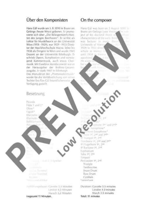 This work was written for the Donaueschingen Musiktage of 1926 and given its first performance there together with Paul Hindemith's 'Konzertmusik' and Ernst Toch's 'Spiel' for wind band. Until a few years ago the score was thought to be lost. This first edition reproduces the original Version but it has been carefully extended so that it can be played by the usual combination of Instruments now found in a wind band. The work is suitable for advanced wind bands and those at the highest level, and is one of the first original compositions for this form of ensemble. Hans Gál was born in Vienna where he studied composition and musicology and then taught at the university. From 1929 until 1933 he was Director of the Musikhochschule in Mainz. He then had to return to Vienna and he emigrated to Edinburgh where he was a university lecturer and conductor. Together with Eusebius Mandyczewski he published the collected works of Brahms