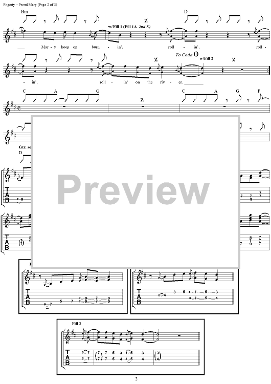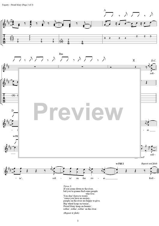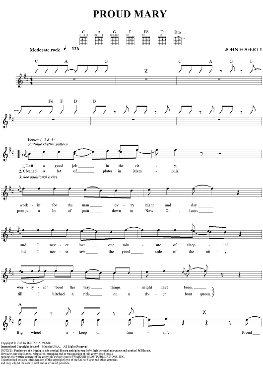 Digital Sheet Music for Proud Mary by Tina Turner, John Fogerty, Creedence Clearwater Revival scored for Guitar Tab/Vocal; id:112931
