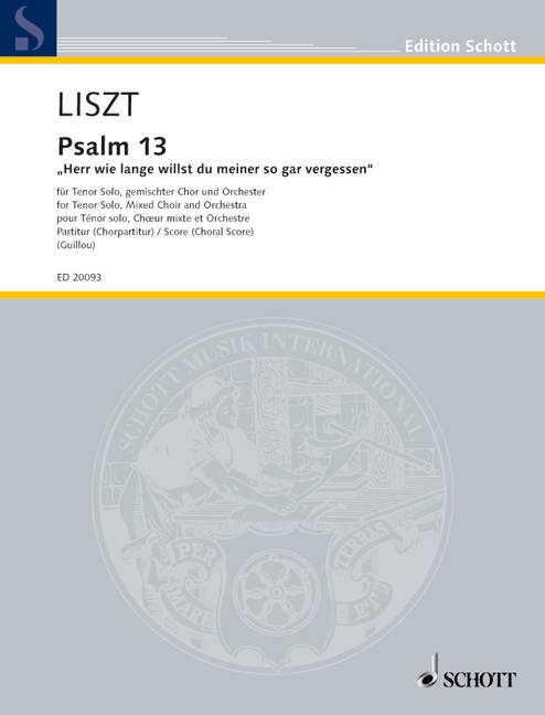 Der XIII. Psalm gilt als eines der großartigsten und zugleich berührendsten Chorstücke Liszts. Die Solopartie ist ein Musterbeispiel für innigsten romantischen Ausdruck und atmet reinsten „Bel Canto“-Geist. Das Werk beinhaltet zwei Fugen: die erste lyrisch-verhalten, die andere rhythmisch-kraftvoll. Die große Orchesterbesetzung verlangt doppeltes Holz und vierfaches Blech. Ihre orchestrale Faktur stellt diese Komposition in eine Reihe mit Liszts Symphonischen Dichtungen oder der Dante-Symphonie. Bei der Aufführung dieser Komposition auf der Orgel kam Guillou zu der Überzeugung, dass die schon einmal erarbeitete und erprobte Orgelbearbeitung zugleich eine sinnvolle Repertoireergänzung für jeden Kirchenmusiker darstellt, der das Werk zwar gerne aufführen würde, die Kosten und den Aufwand eines so großen Orchesterapparats jedoch scheut. Die Ausgabe bietet eine gute und praktikable Möglichkeit der Aufführung, die einen adäquaten Eindruck von diesem Meisterwerk vermittelt. Aus dem Vorwort von Jean Guillou (in der Übersetzung von Wolfram Adolph)