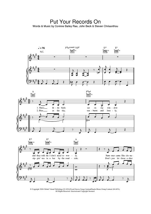 Digital Sheet Music for Put Your Records On by Corinne Bailey Rae, John Beck, Steven Chrisanthou scored for Piano/Vocal/Chords; id:389314