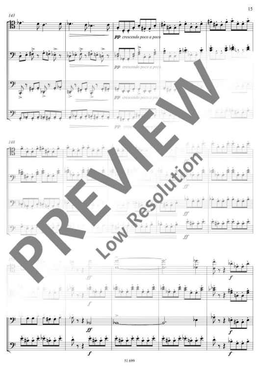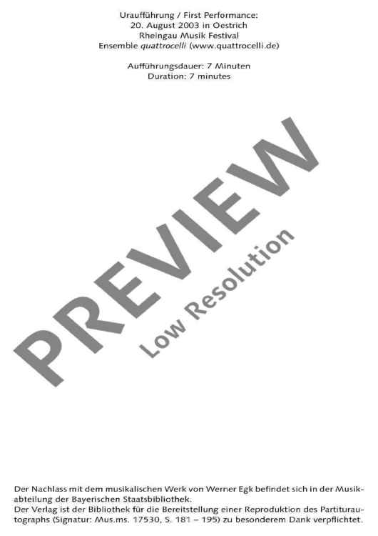 Werner Egk komponierte dieses Stück mit 24 Jahren und hinterließ es aber als Fragment. Der Herausgeber hat das einsätzige Quartett mit kompositorischen Mitteln, die Egk bereits vorgegeben hat, vollendet. Mit einer Ausdruckspalette, die von eigentümlich gebrochenen Neoklassizismen bis zu klanglichen Widerborstigkeiten reicht, ist dieses Jugendwerk gerade für ambitionierte Interpreten und einem neugierigen, aufgeschlossenen Konzertpublikum höchst interessant. Mit diesem originalen und originellen Stück wird die Literatur für Celloquartett wesentlich bereichert.