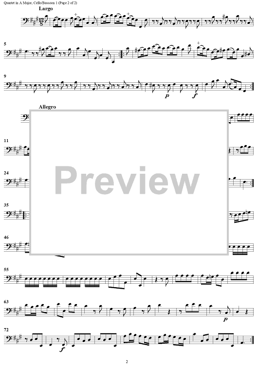 Digital Sheet Music for Quartet in A major - Cello/Bassoon 1 by Georg Philipp Telemann scored for 2 Flutes or Violins, 2 Bassoons or Cellos; id:178160