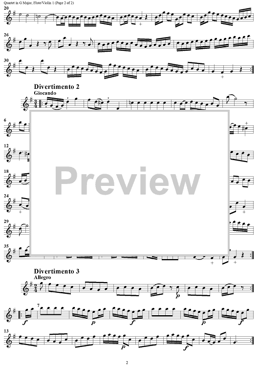 Digital Sheet Music for Quartet in G major - Flute 1/Violin 1 by Georg Philipp Telemann scored for 2 Flutes or Violins, 2 Bassoons or Cellos; id:183872