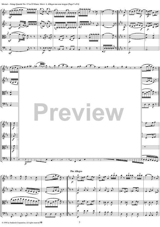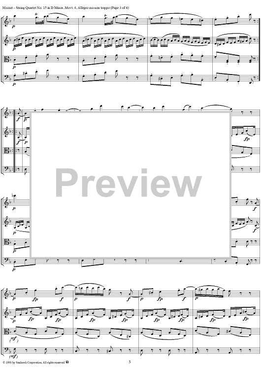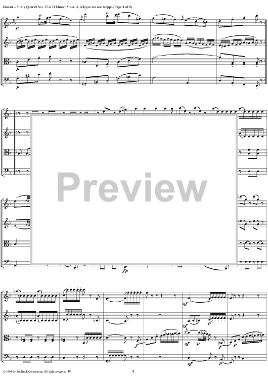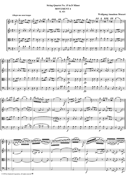 Digital Sheet Music for Quartet No. 15, Movement 4 - Score by Wolfgang Amadeus Mozart scored for String Quartet; id:108874