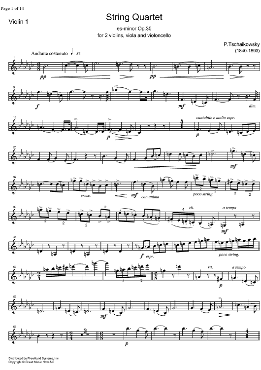 "Quartet No. 3 in E-flat minor (es-moll) - Violin 1" Sheet Music by Peter Ilyich Tchaikovsky
