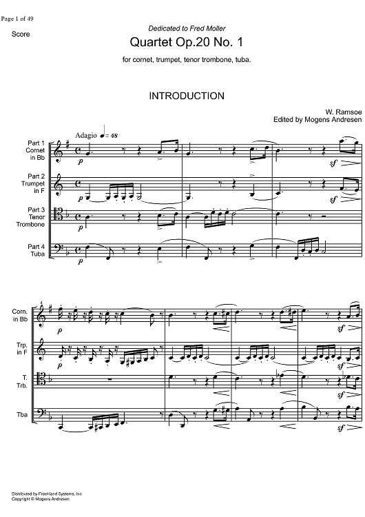 Digital Sheet Music for Quartet Op.20 No. 1 - Score by , Wilhelm Ramsoe scored for Brass Quartet; id:329963