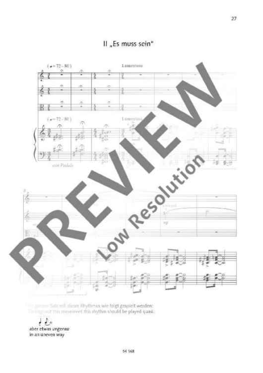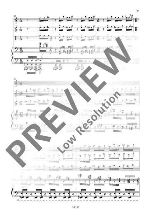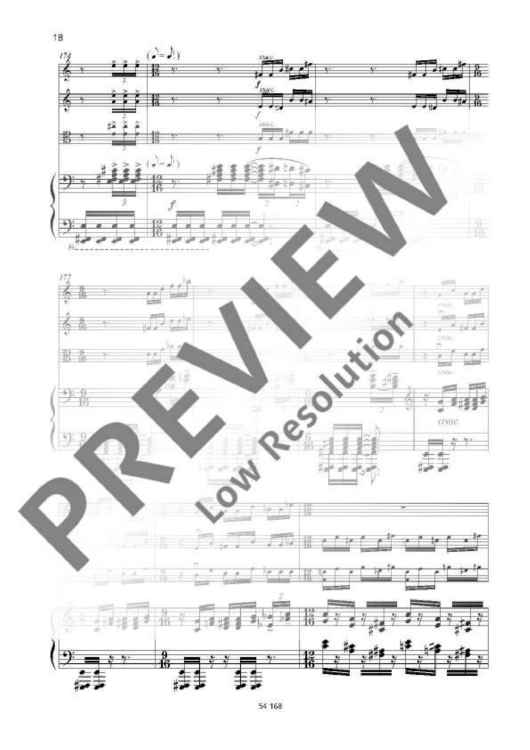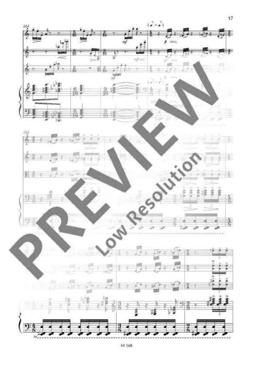 Olli Mustonen, the Finnish pianist, composer and conductor, is at home on all concert stages of the world. Recently, he has mainly composed chamber music works. His Quartetto with the allusive movement headings 'Quasi una passacaglia' and 'Es muss sein' provides a wide sound spectrum evolving due to the possible combinations of instruments. According to the traditional pattern, calm and emotional passages alternate with extremely lively and virtuoso passages. The piece requires high technical skills, has an immediate catchy effect and is suitable for any concert programme.