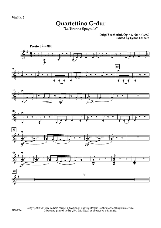Digital Sheet Music for Quartettino G-dur "La Tiranna Spagnola" Op. 44, No. 4 - Violin 2 by Luigi Boccherini, Lynne Latham scored for String Quartet; id:462583