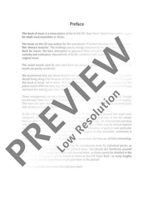 Bach newly interpreted – the vocal band Slixs edited a songbook for mixed vocal ensemble or small choral ensemble containing unusual arrangements of instrumental works by Johann Sebastian Bach. The arrangements range between classical interpretation and flirting with jazz. They demand from the singers a profound basic education in music and flexible alternation between the voices. Explanations of how to pronounce the syllables to be sung help to generate equal instrumental tones.