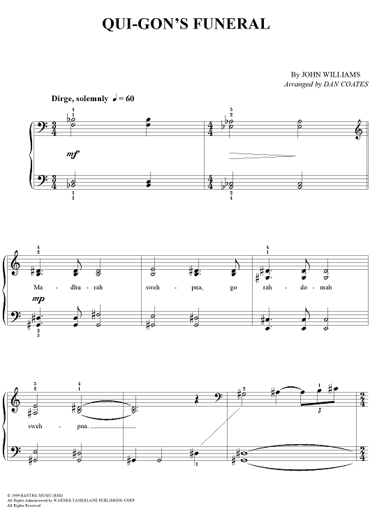 Digital Sheet Music for Qui-Gon's Funeral by Dan Coates, John Williams scored for Easy Piano/Vocal; id:235985