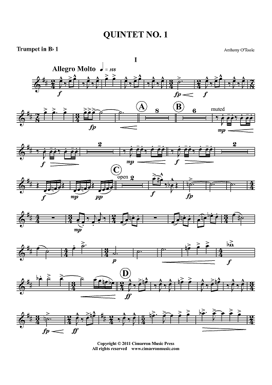 "Quintet No. 1 - Trumpet 1 in Bb" Sheet Music by Anthony O'Toole
