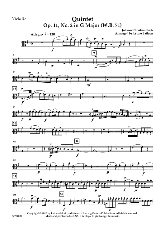 Digital Sheet Music for Quintet Op. 11, No. 2 in G Major (W.B. 71) - Viola (2) by Johann Christian Bach, Lynne Latham scored for String Quintet; id:462592