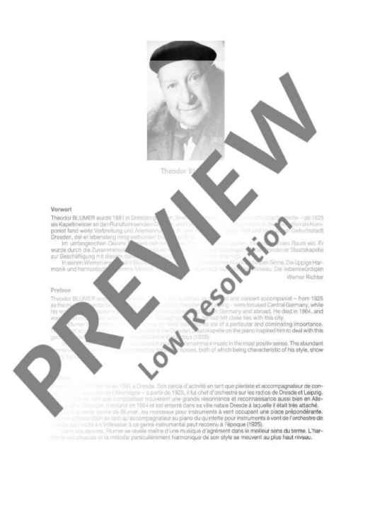 Theodor Blumer wurde 1881 in Dresden geboren. Ab 1925 wirkte er als Kapellmeister an den Rundfunksendern Dresden und Leipzig, sein Schaffen als Komponist fand weite Verbreitung im In- und Ausland. Er starb 1964 und ist in seiner Geburtsstadt Dresden, der er lebenslang innig verbunden blieb, begraben. Im umfangreichen Oeuvre Blumers nehmen Werke für Bläser einen großen Raum ein, angeregt durch die Zusammenarbeit mit dem Bläserquintett der Dresdner Staatskapelle. In seinen Werken erweist sich Blumer als Meister einer unterhaltsamen Musik im besten Sinne. Die üppige Harmonik und harmonisch bestimmte Melodik seines Stils bewegen sich auf höchstem Niveau.