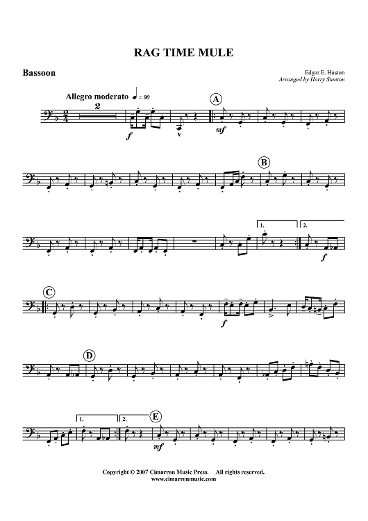 "Rag Time Mule - Bassoon" Sheet Music by E. Huston