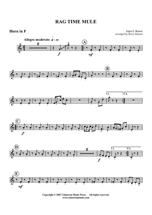 "Rag Time Mule - Horn in F" Sheet Music by E. Huston