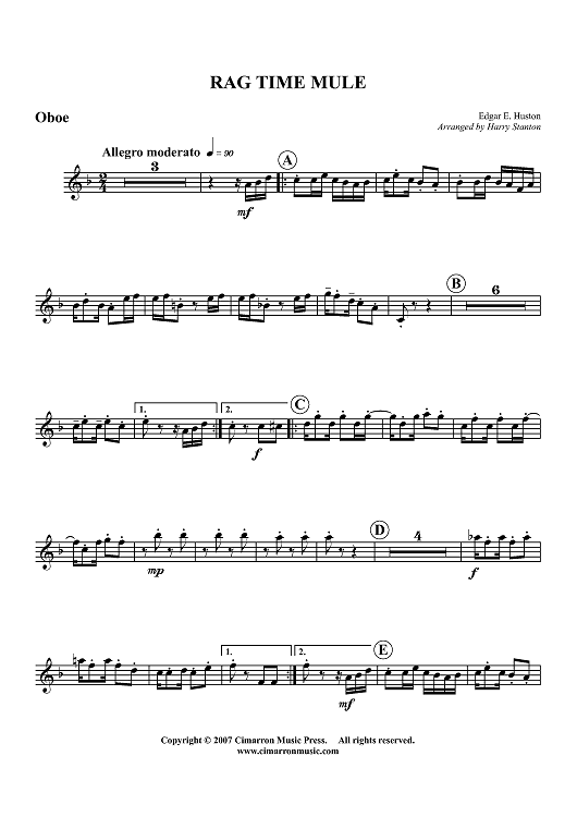 "Rag Time Mule - Oboe" Sheet Music by E. Huston