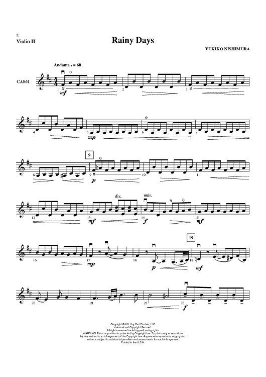 "Rainy Days - Violin 2" Sheet Music by Yukiko Nishimura