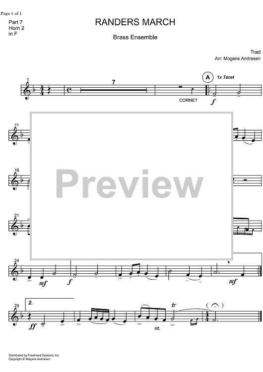 Digital Sheet Music for Randers March - Horn in F 2 by Unknown Writer, Mogens Andresen scored for Brass Ensemble; id:324297