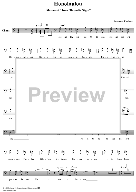 "Rapsodie Nègre, III. Honoloulou - Voice" Sheet Music by Francis Poulenc