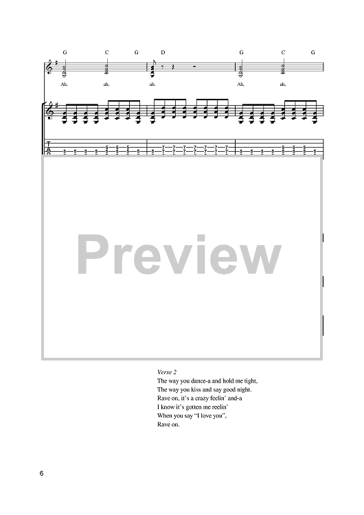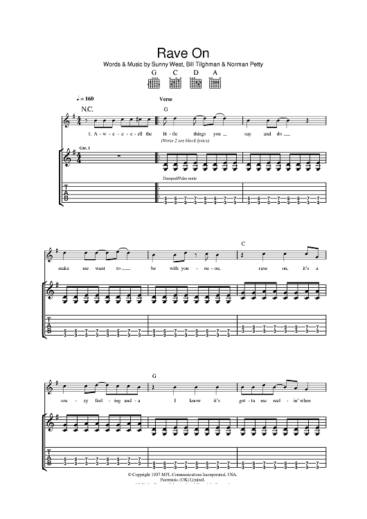 Digital Sheet Music for Rave On by Norman Petty, Buddy Holly, Sunny West, Bill Tilghman scored for Guitar Tab; id:398830