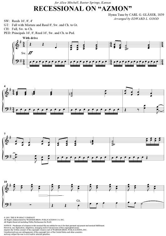 Digital Sheet Music for Recessional on "Azmon" by Carl G. Glaser, Edward L. Good scored for Organ Solo; id:292595