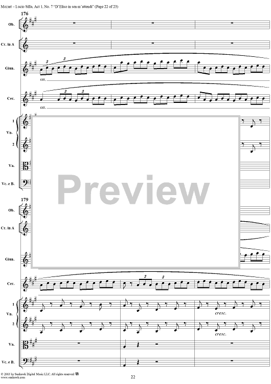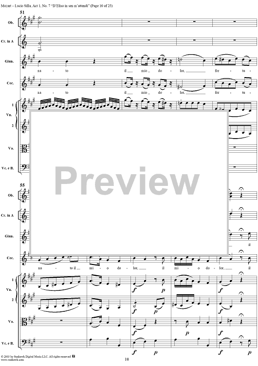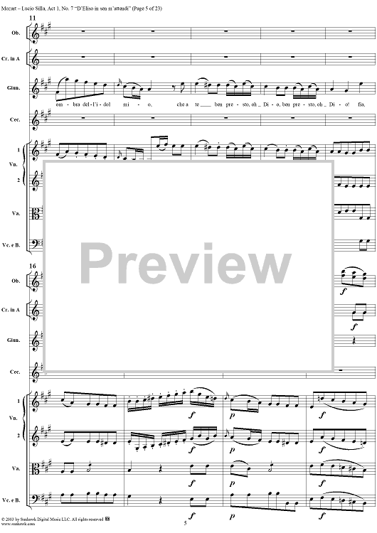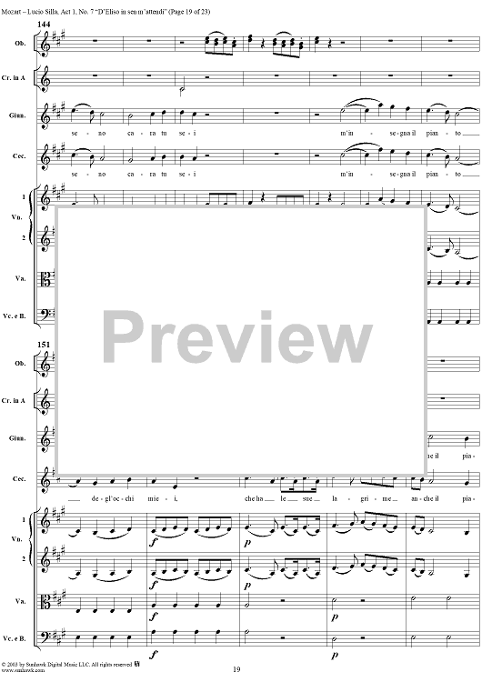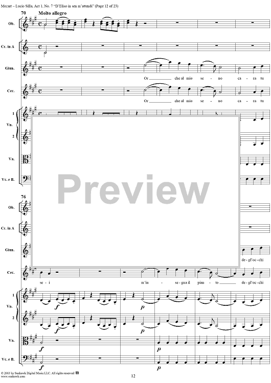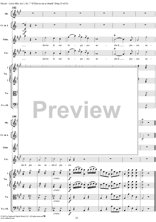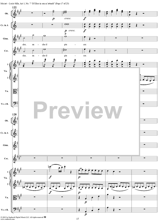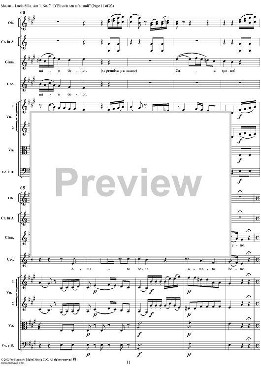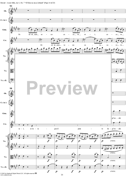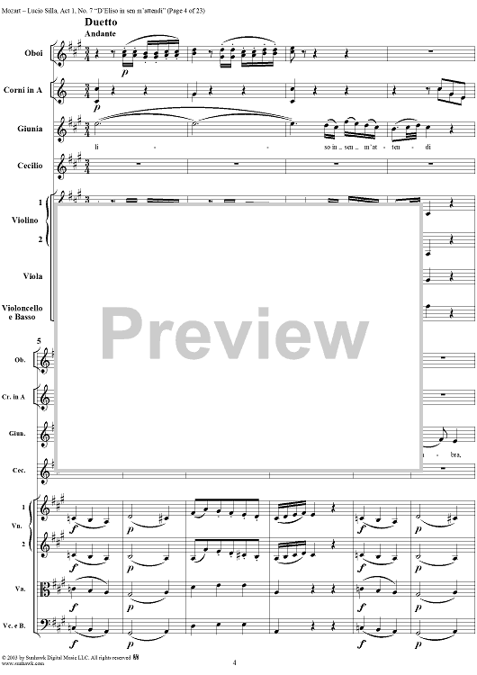 Digital Sheet Music for Recitative and Duet: D'Eliso in sen m'attendi, No. 7 from "Lucio Silla", Act 1 - Full Score by Wolfgang Amadeus Mozart scored for Soli/SATB/Orchestra; id:291296