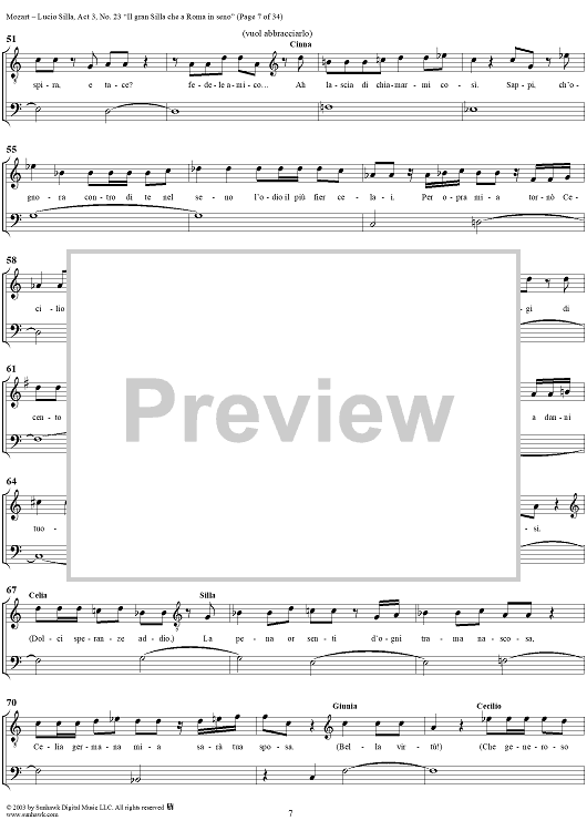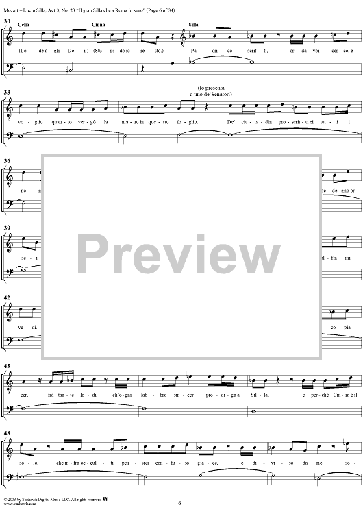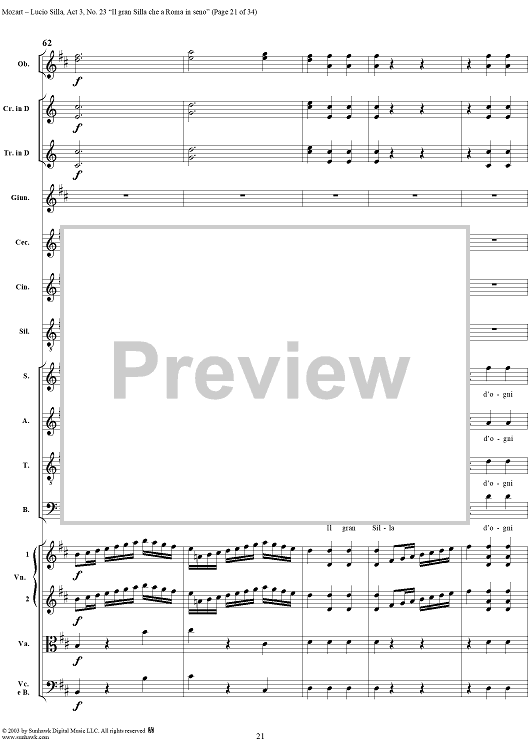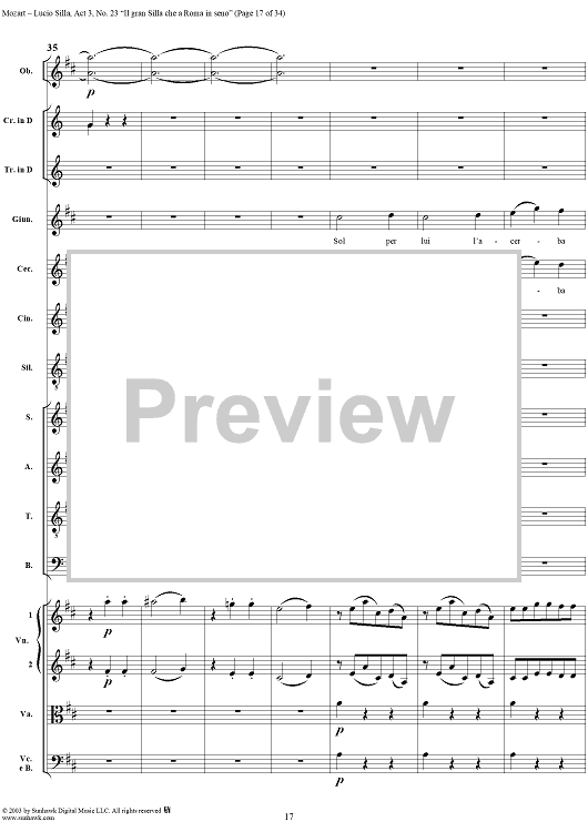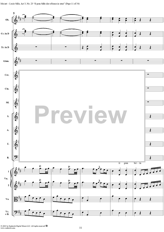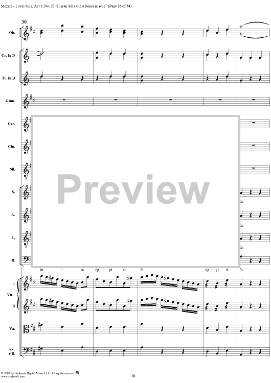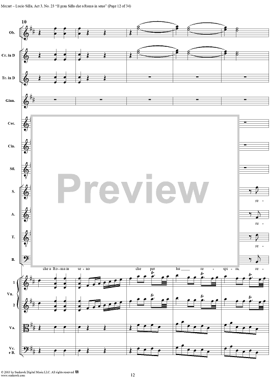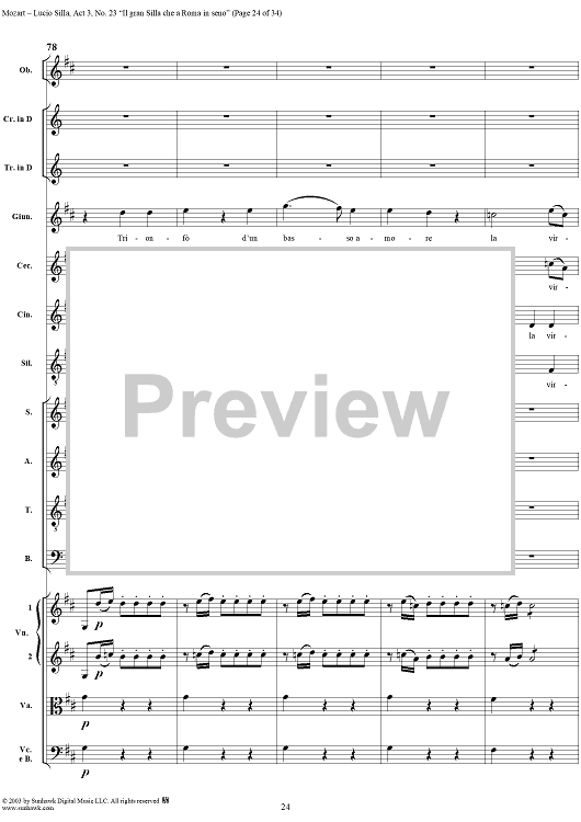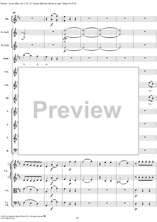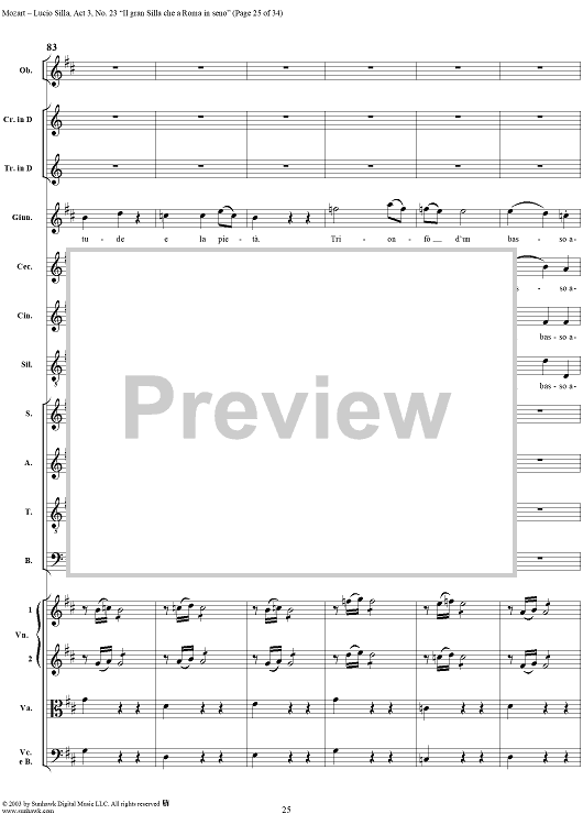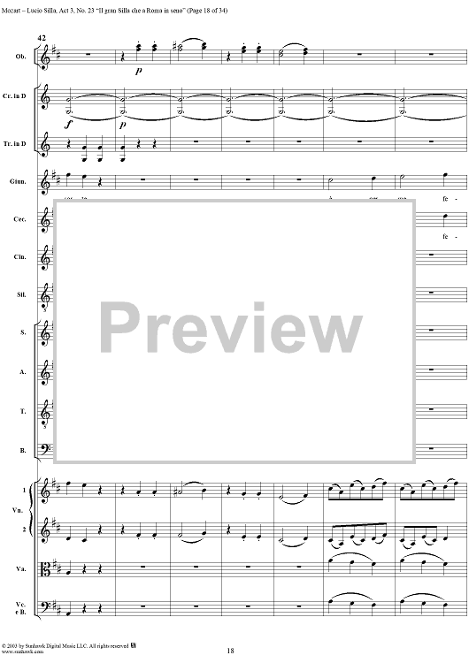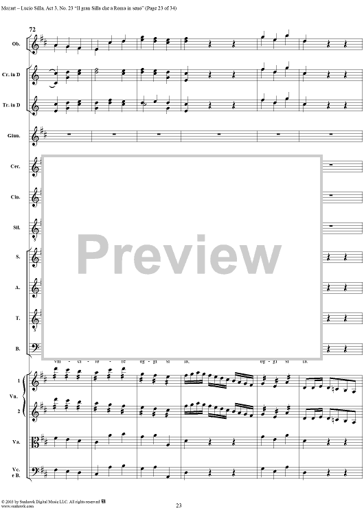 Digital Sheet Music for Recitative and Final Chorus: Il gran Silla che a Roma in seno, No. 23 from "Lucio Silla", Act 3 - Full Score by Wolfgang Amadeus Mozart scored for Soli/SATB/Orchestra; id:291361
