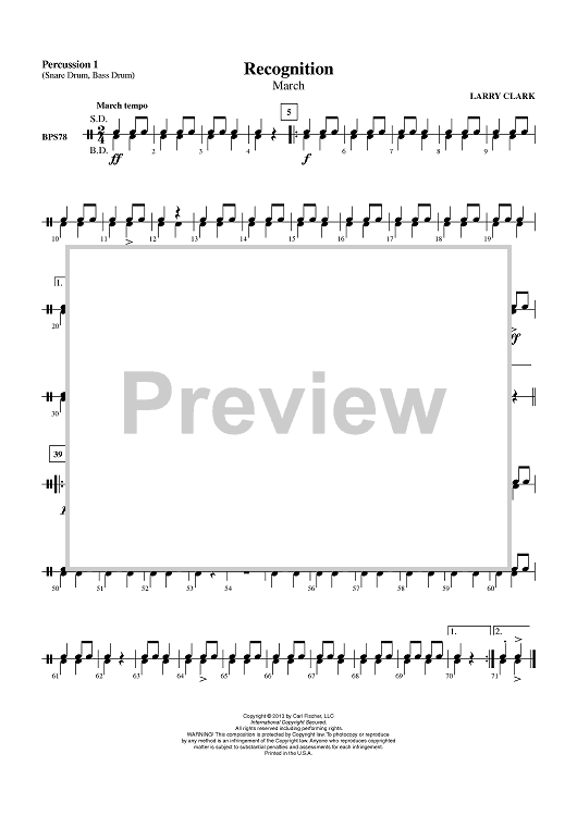 Digital Sheet Music for Recognition (March) - Percussion 1 by Larry Clark scored for Concert Band; id:435434