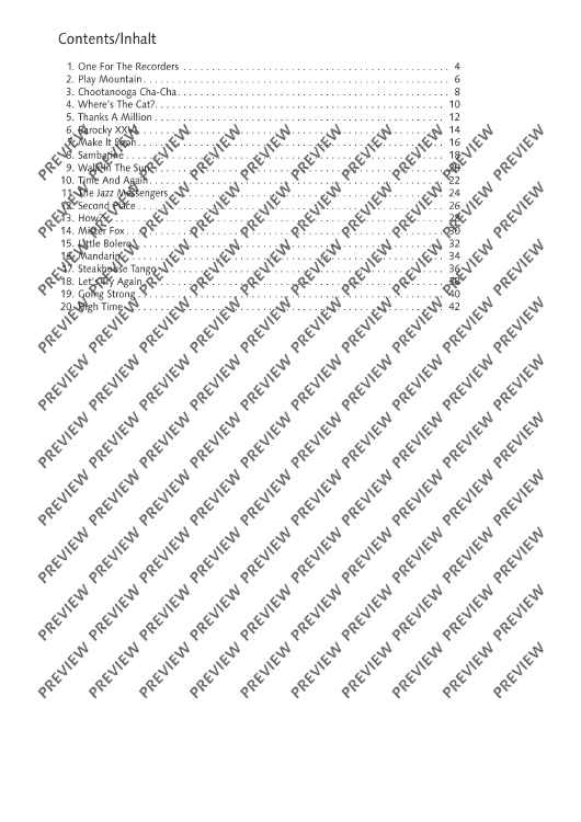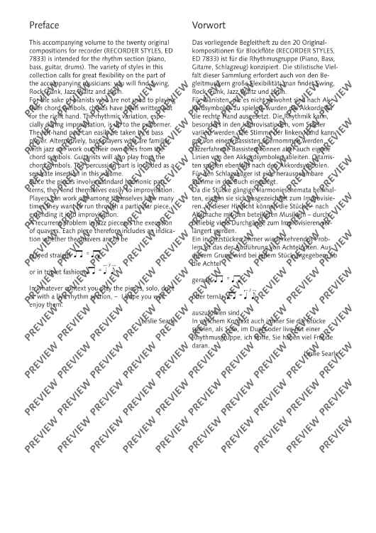 Recorder players are more and more interested in playing popular music and jazz. In this collection, the British jazz musician Leslie Searle presents his own compositions in a variety of the most common musical styles of modern jazz and dance music. The book for the rhythm section contains accompanying parts for piano, bass and percussion.