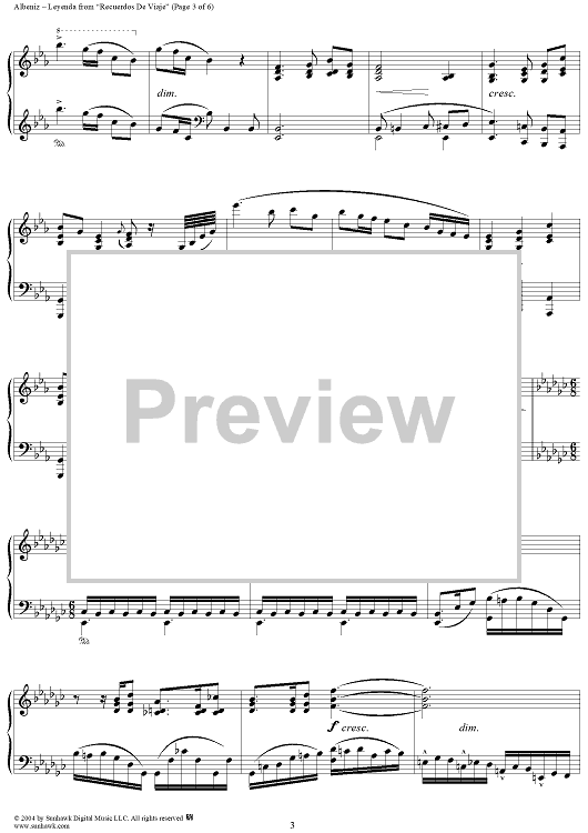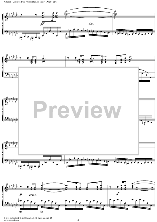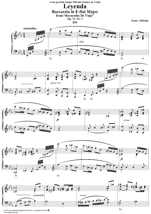 Digital Sheet Music for Recuerdos De Viaje, Op. 71: No. 2, Leyenda, Barcarola in E-flat Major by Isaac Albéniz scored for Piano Solo; id:296596
