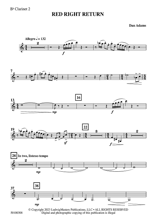"Red Right Return - Bb Clarinet 2" Sheet Music by Dan Adams