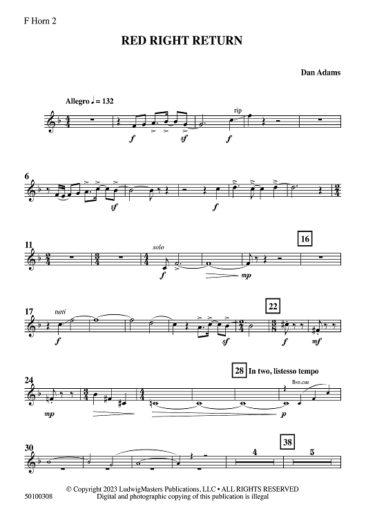 Digital Sheet Music for Red Right Return - F Horn 2 by Dan Adams scored for Concert Band; id:509289