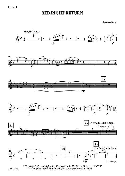 "Red Right Return - Oboe 1" Sheet Music by Dan Adams